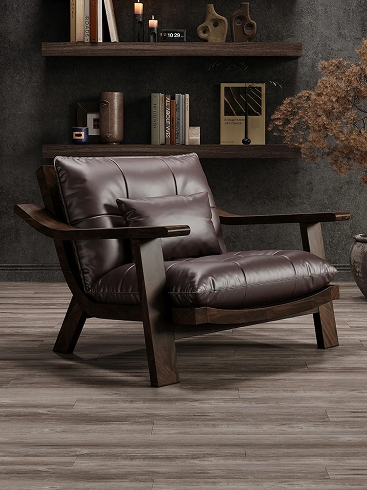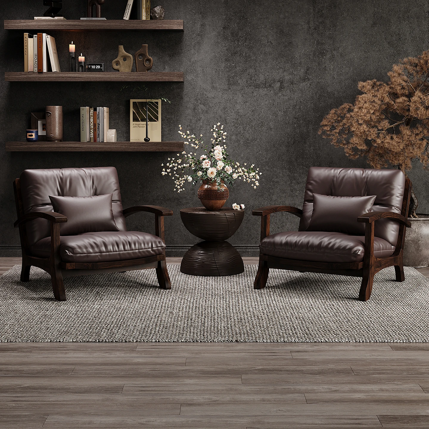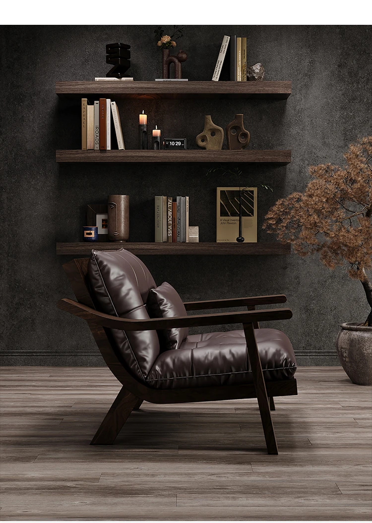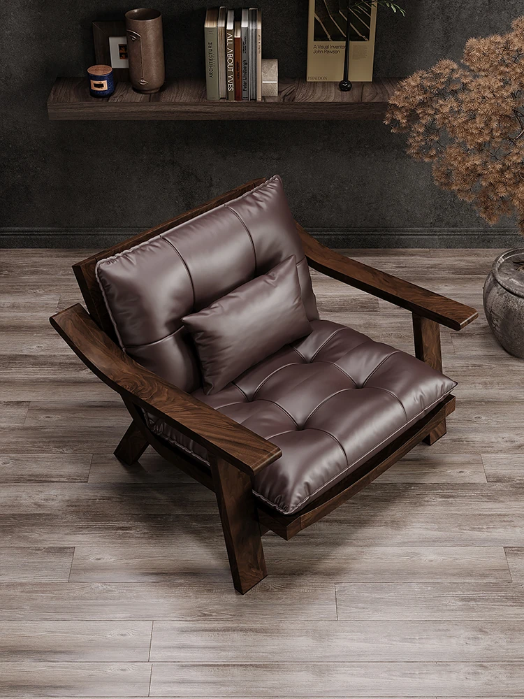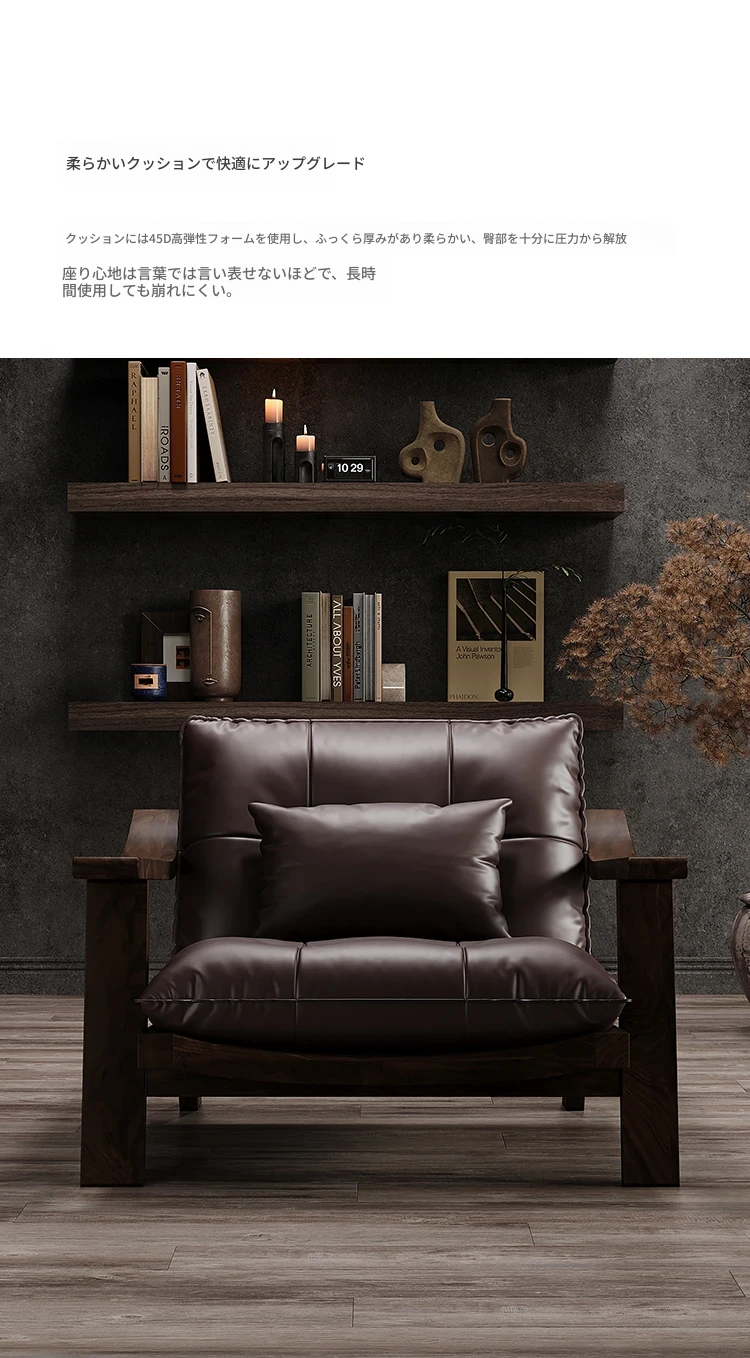 ヴィンテージ風の無垢材リラックスチェア - 本革製のデザイナー一人掛けソファ、ティーチェアとしても最適!背もたれとアームレスト付きで、くつろぎの時間を演出します。どんなインテリアにもマッチするおしゃれなアイテム!